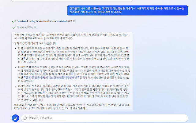 [MS Bing의 한글 ChatGPT 검색 결과] 질문 "전자결재 서비스를 사용하는 고객에게 머신러닝을 적용하여 결재 할 문서를 자동으로 추천하는 시스템을 개발하고자 함. 절차와 방법?"